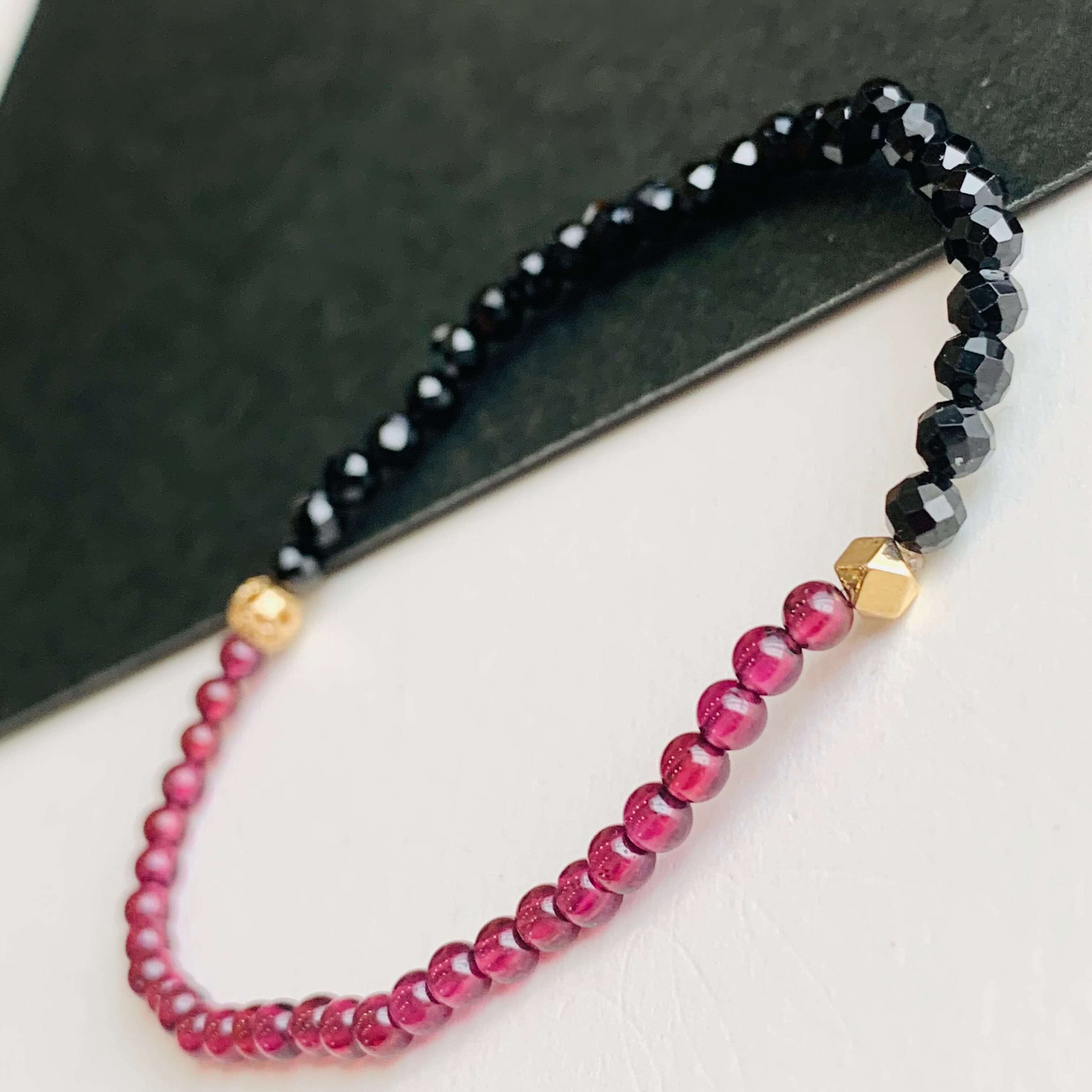 3㍉台のブラックスピネル24面カット珠と紫ガーネットに18金メッキビーズのデザインブレスレット