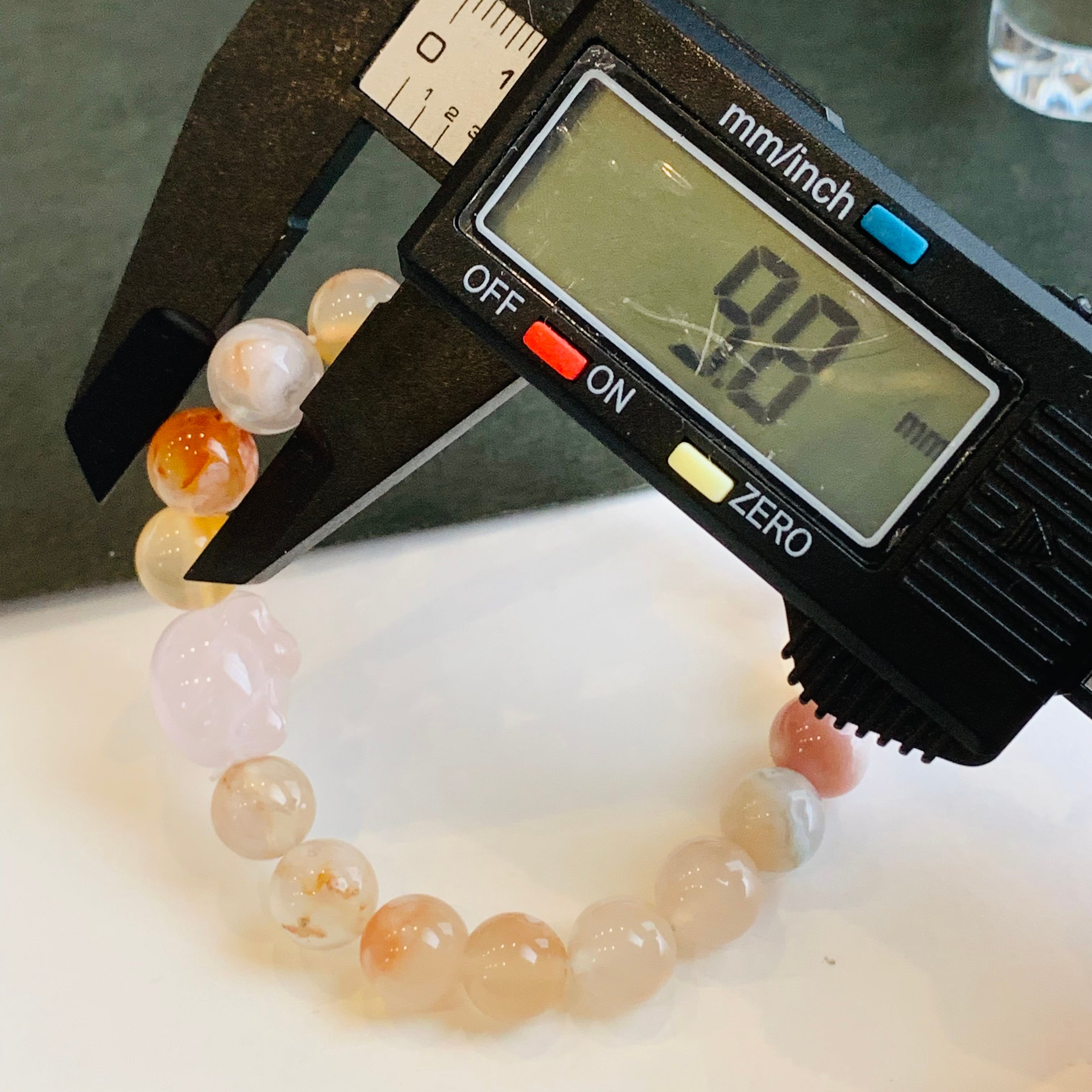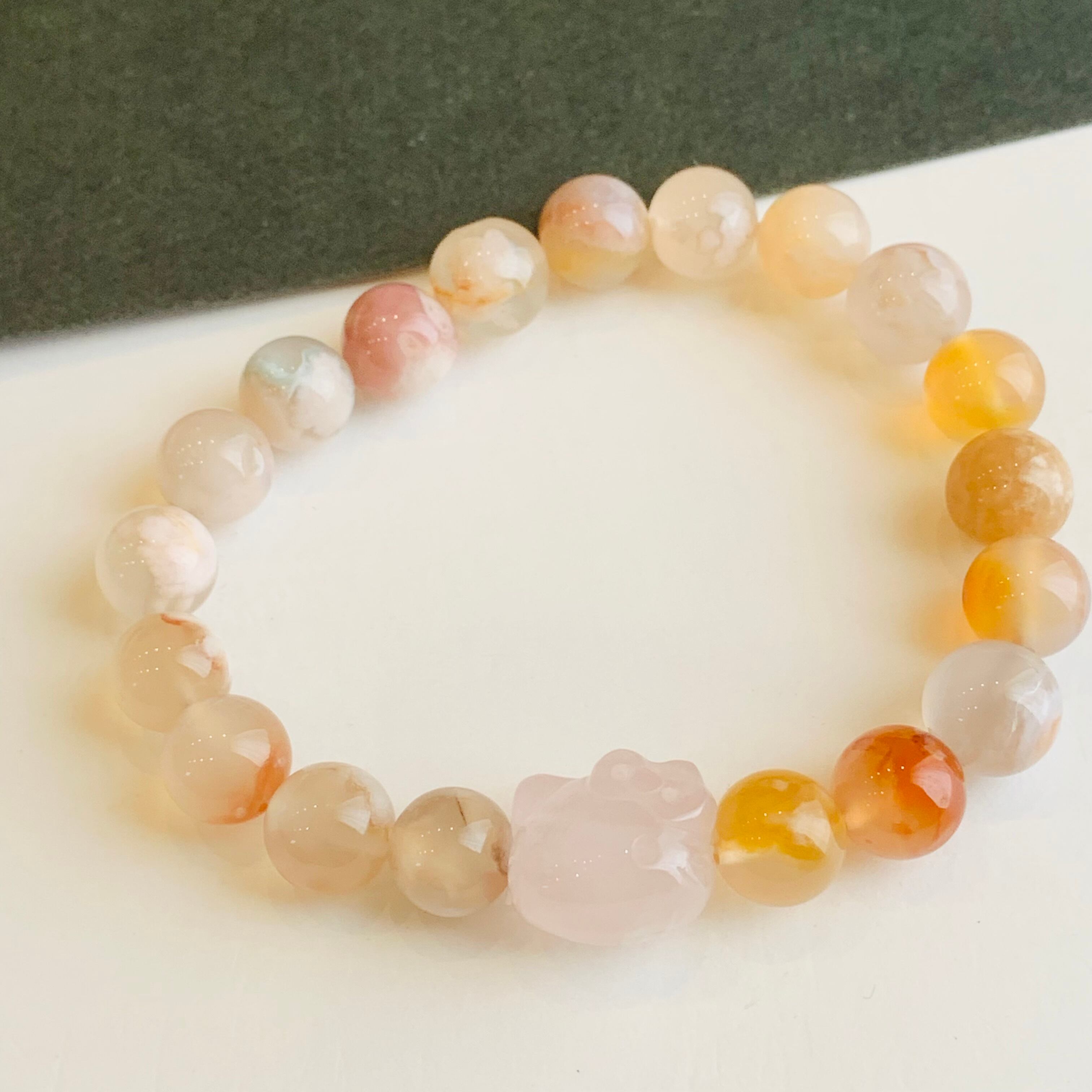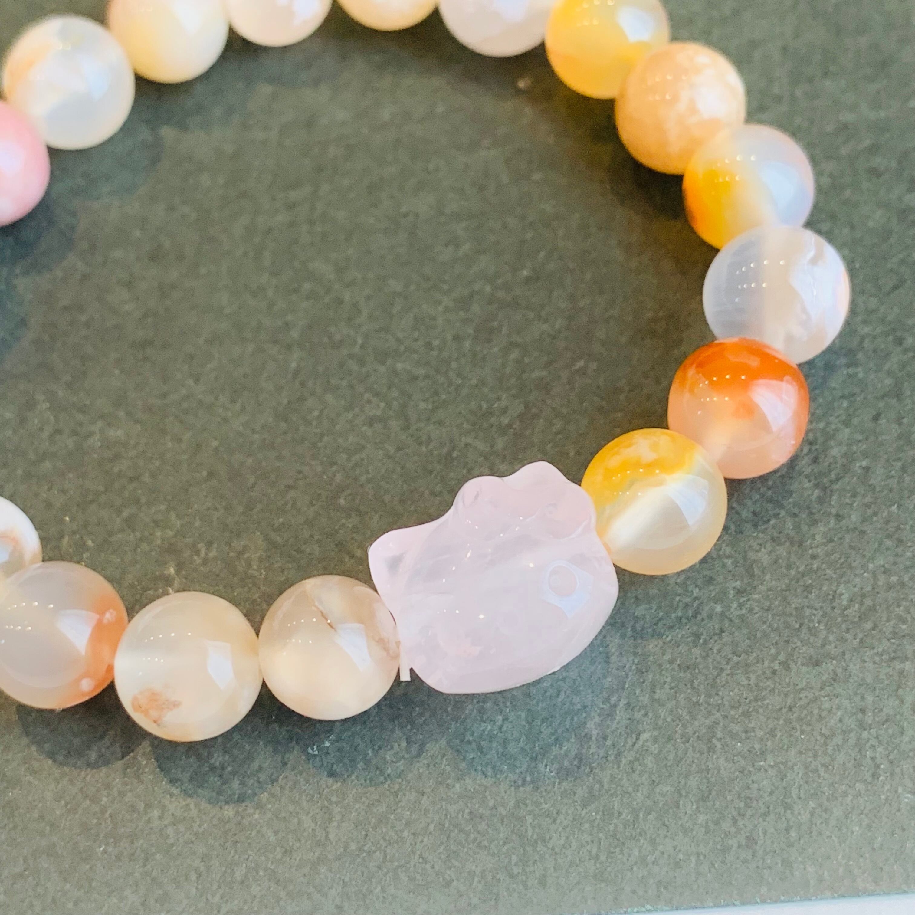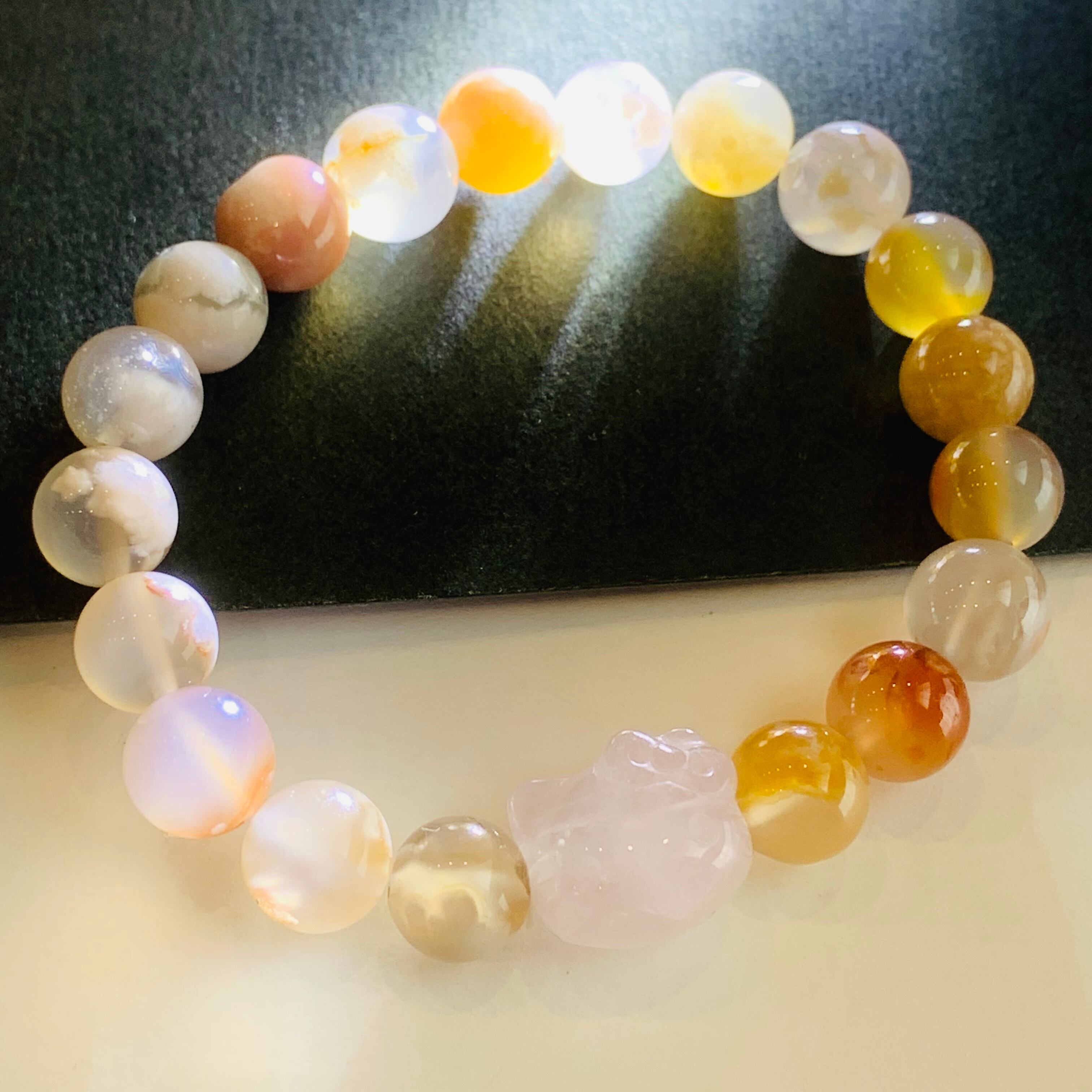 桜メノウ ブレスレット ローズクォーツ猫チャーム 瑪瑙 R122