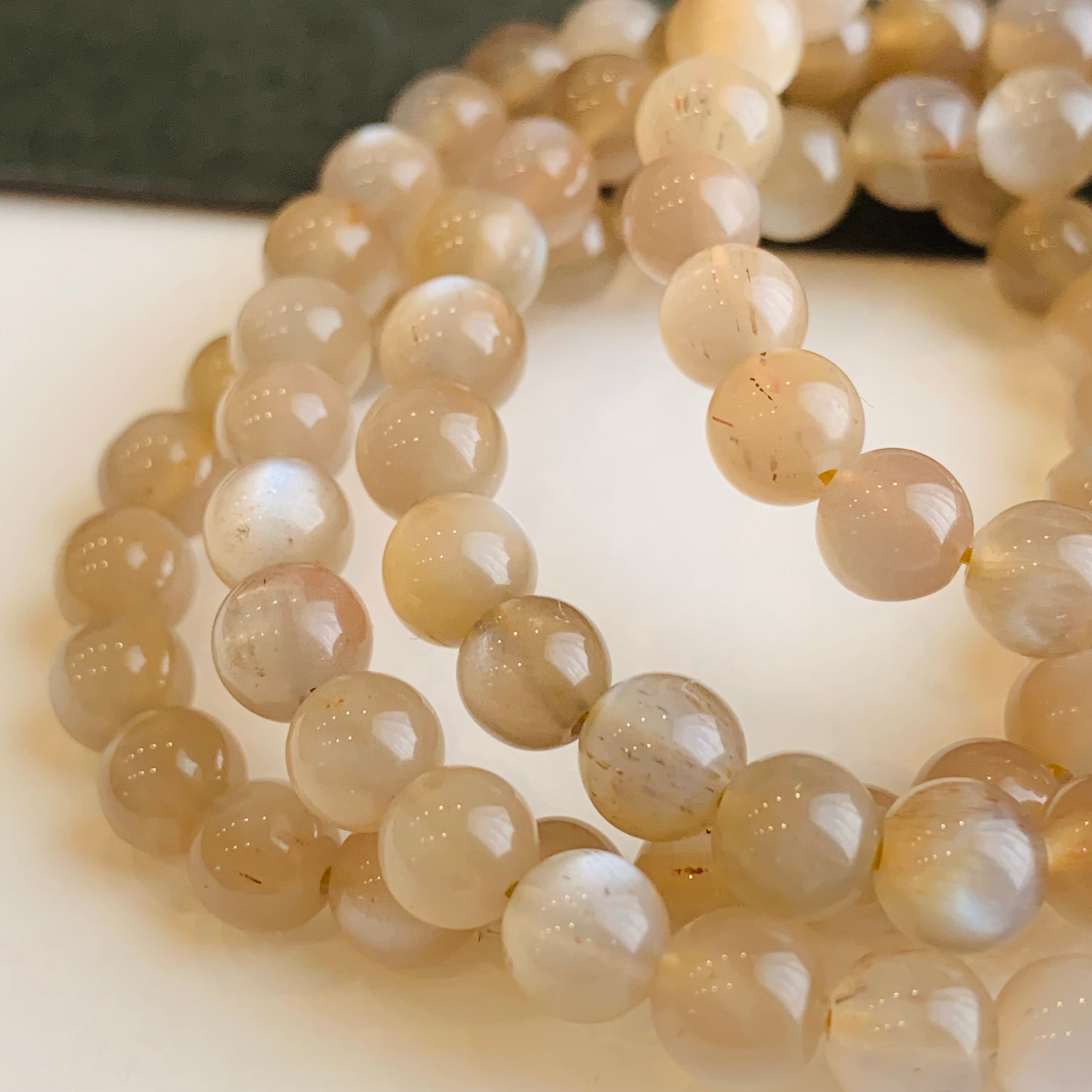 金色をベースとしたムーンストーンに、ゴールドとシルバーのシーラ、そして内包された繊維状のレピドクロサイトに光が反射して現れるアベンチュレッセンス、そして稀にキャッツアイ効果(シャットヤンシー)が現れるものがあります。