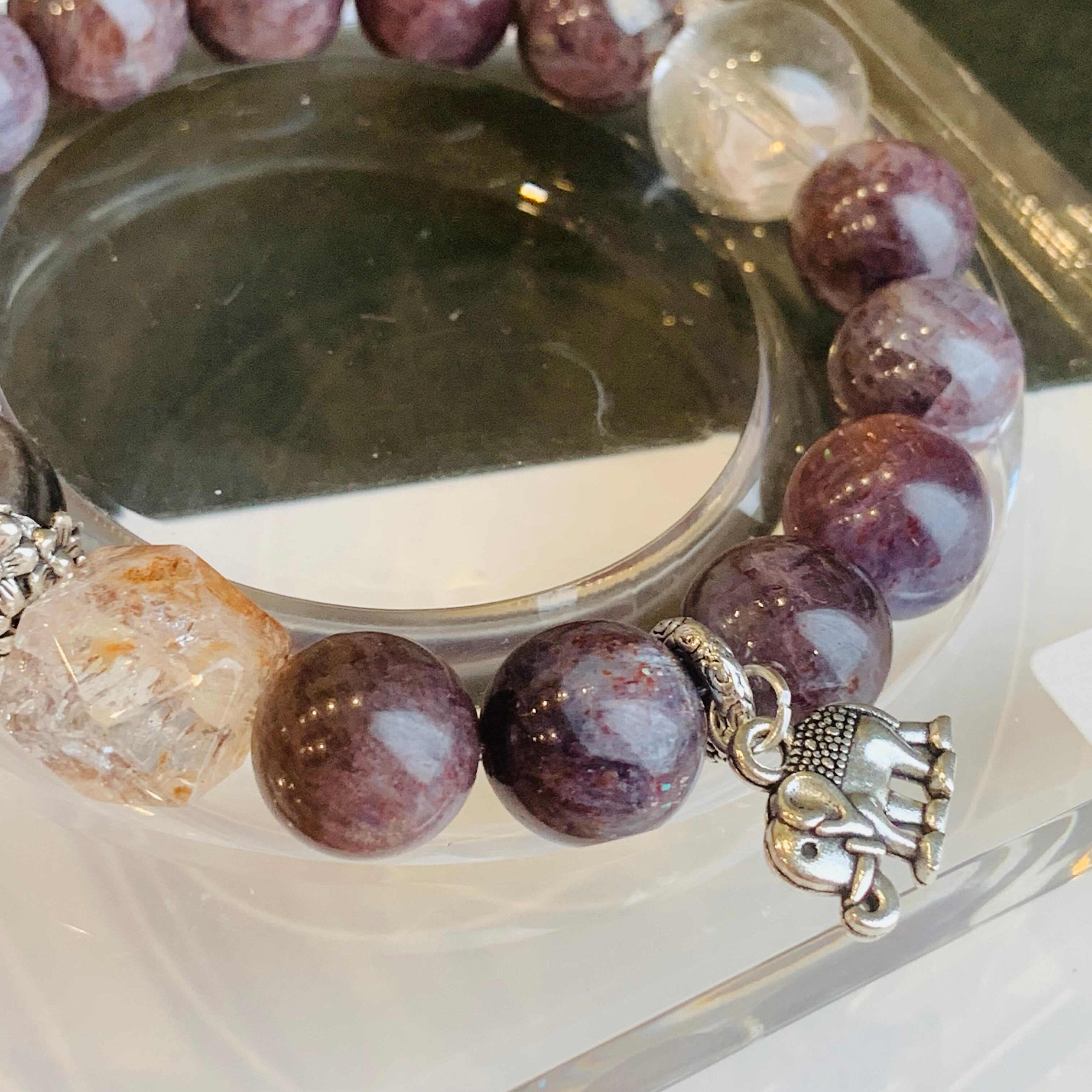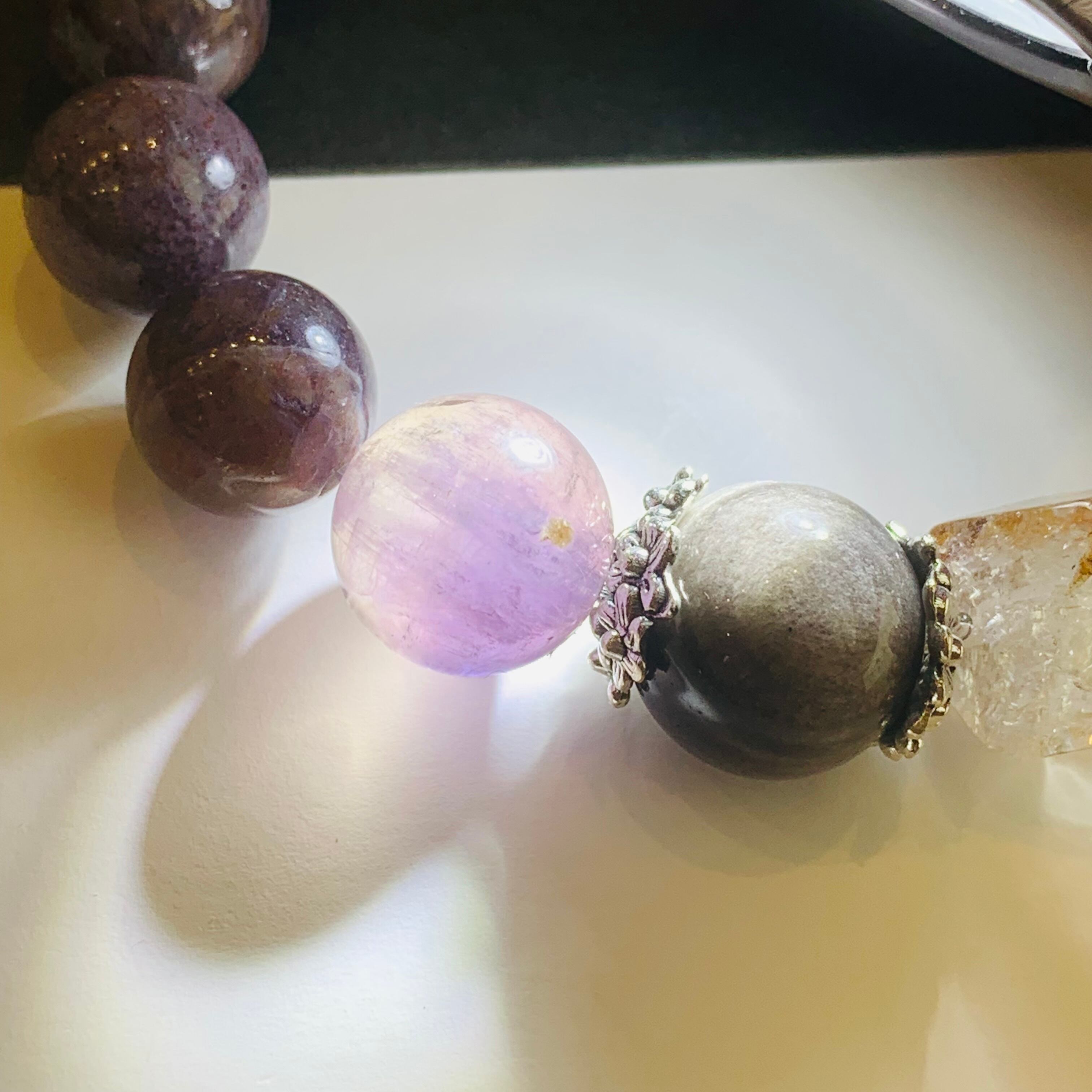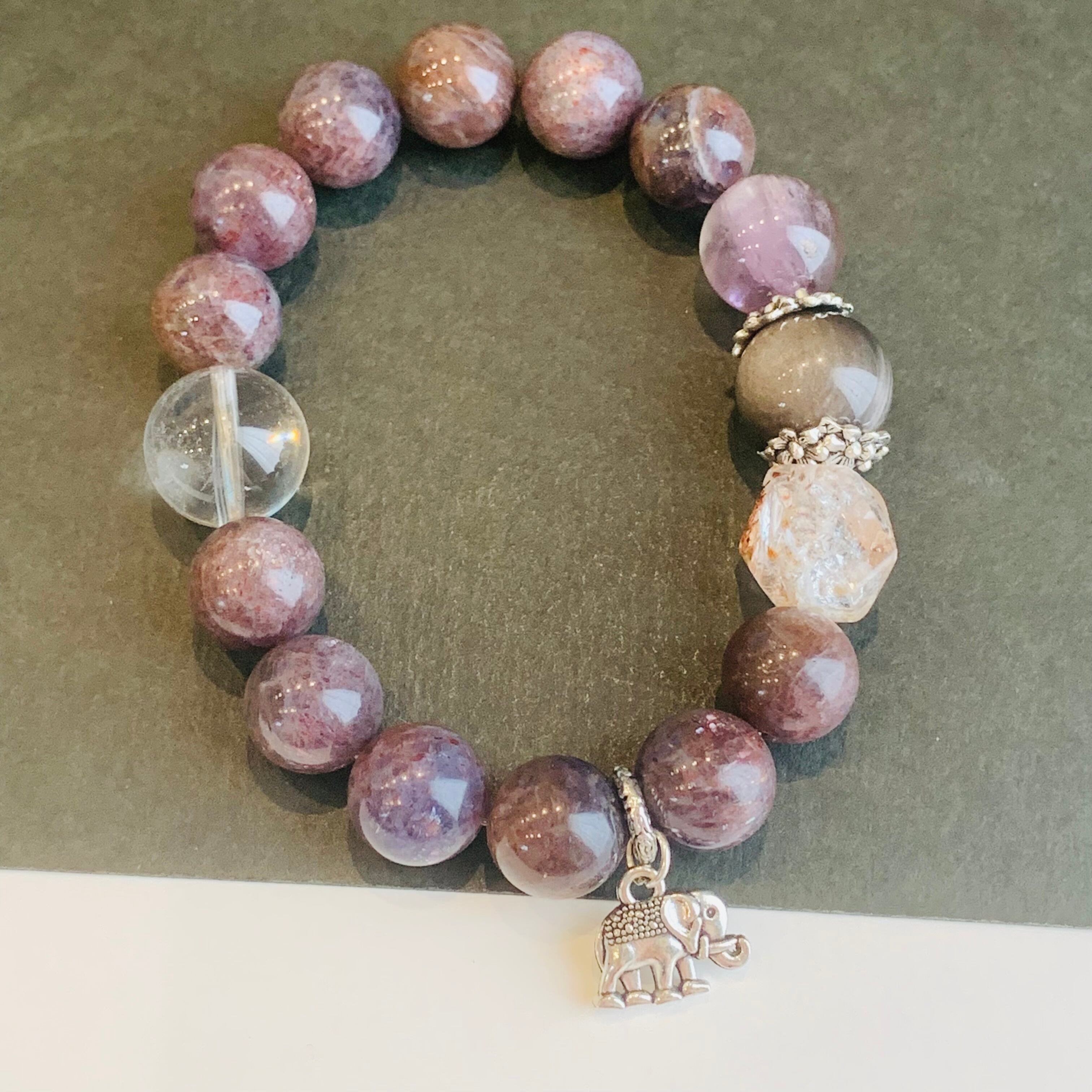 ヒマラヤクォーツ、ハーキマーダイヤモンド、オーラライト23とシルバーオブシディアン、シルバーパーツで組んだデザインブレス