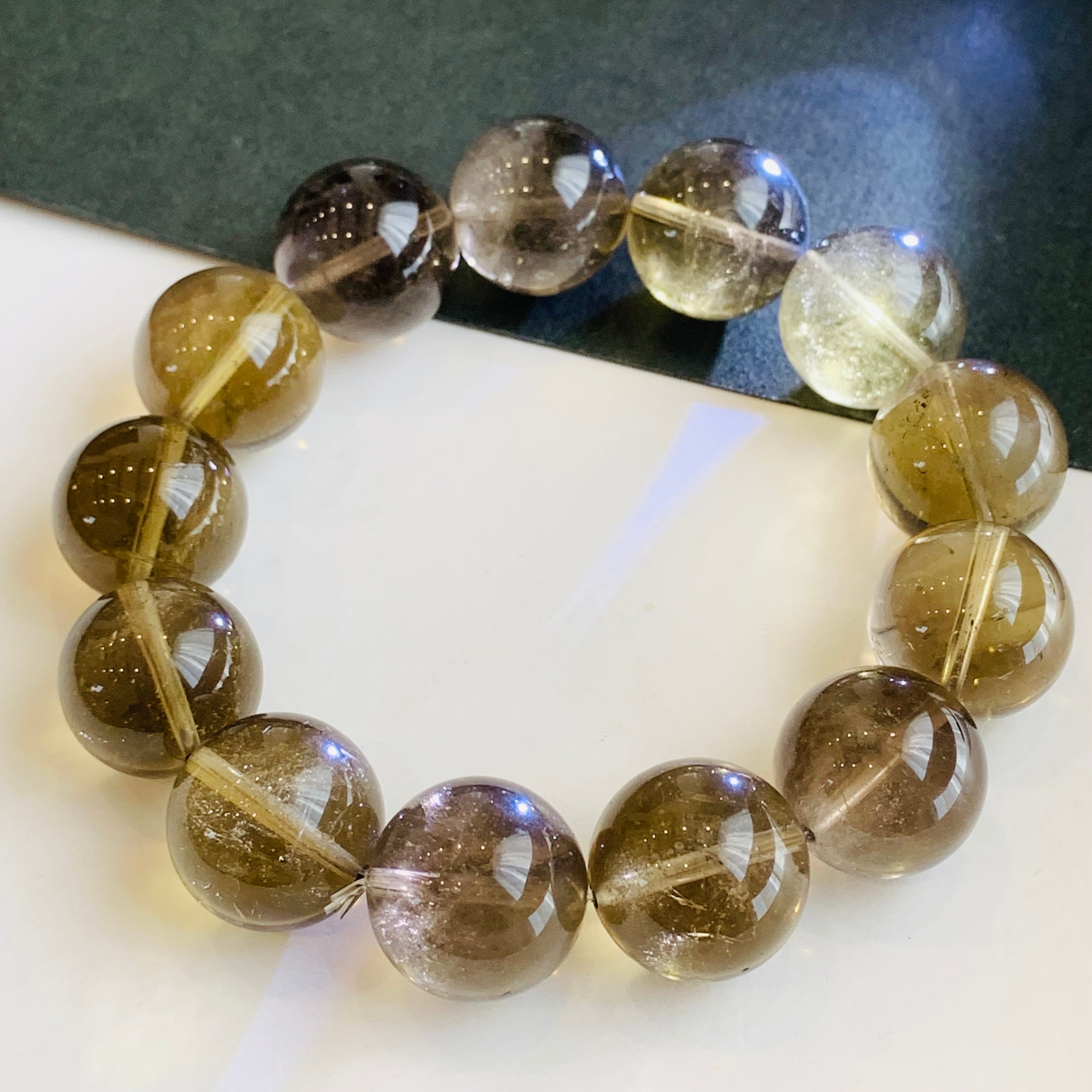 「魔晶ゼウス」とは、「ゼウスクォーツ」と呼ばれる希少なパワーストーンで、シトリン(黄水晶)とスモーキークォーツ(煙水晶)が一部に融合したもの、またはアメジストとシトリンが混じり合ったアメトリンを指します。この石は空間のエネルギーを安定させ、浄化のパワーが強力であるとされ、シトリンの金色とスモーキークォーツのブラウンカラーが見事に溶け合った美しいグラデーションが特徴で、市場への入荷が少ない珍しいアイテムです
