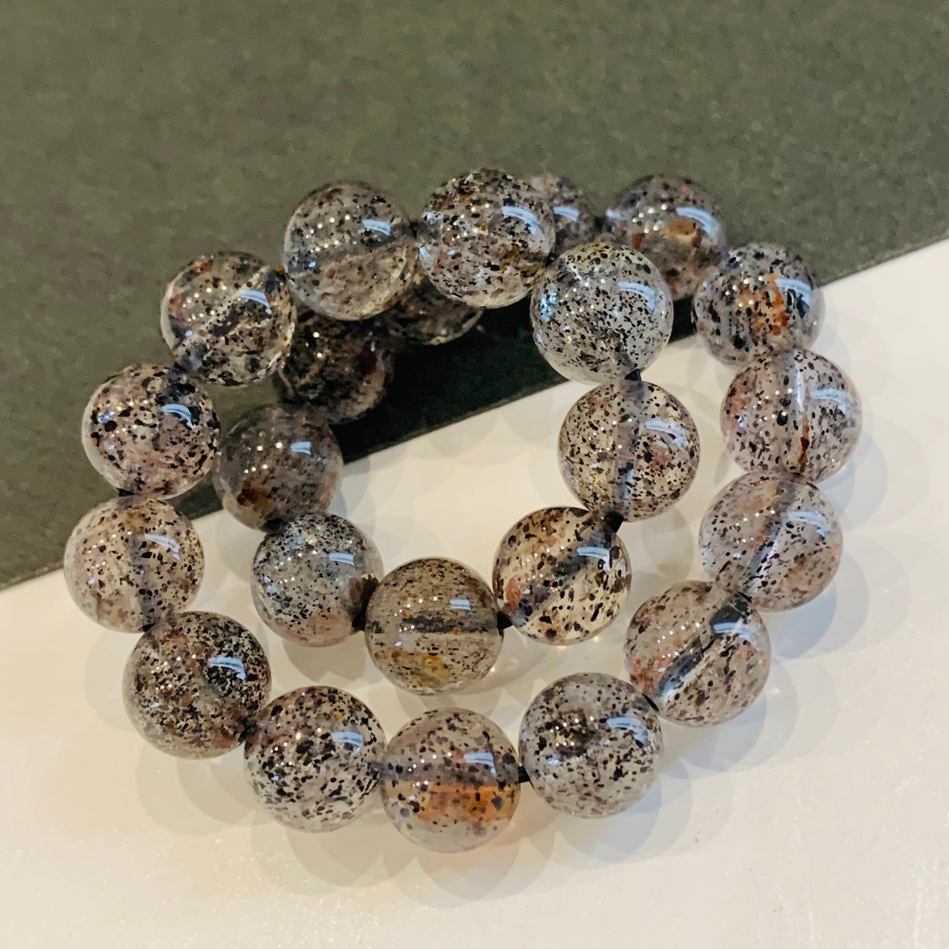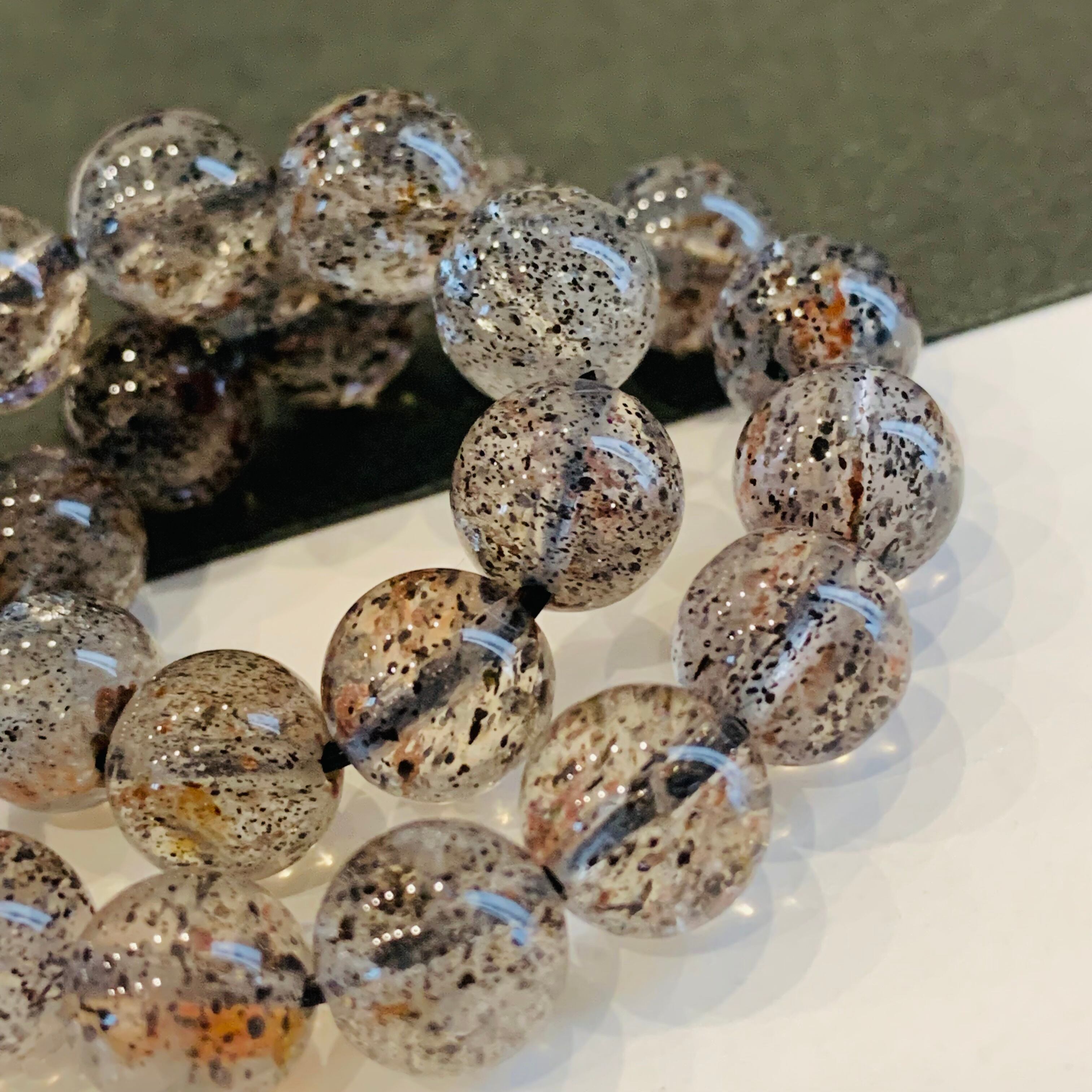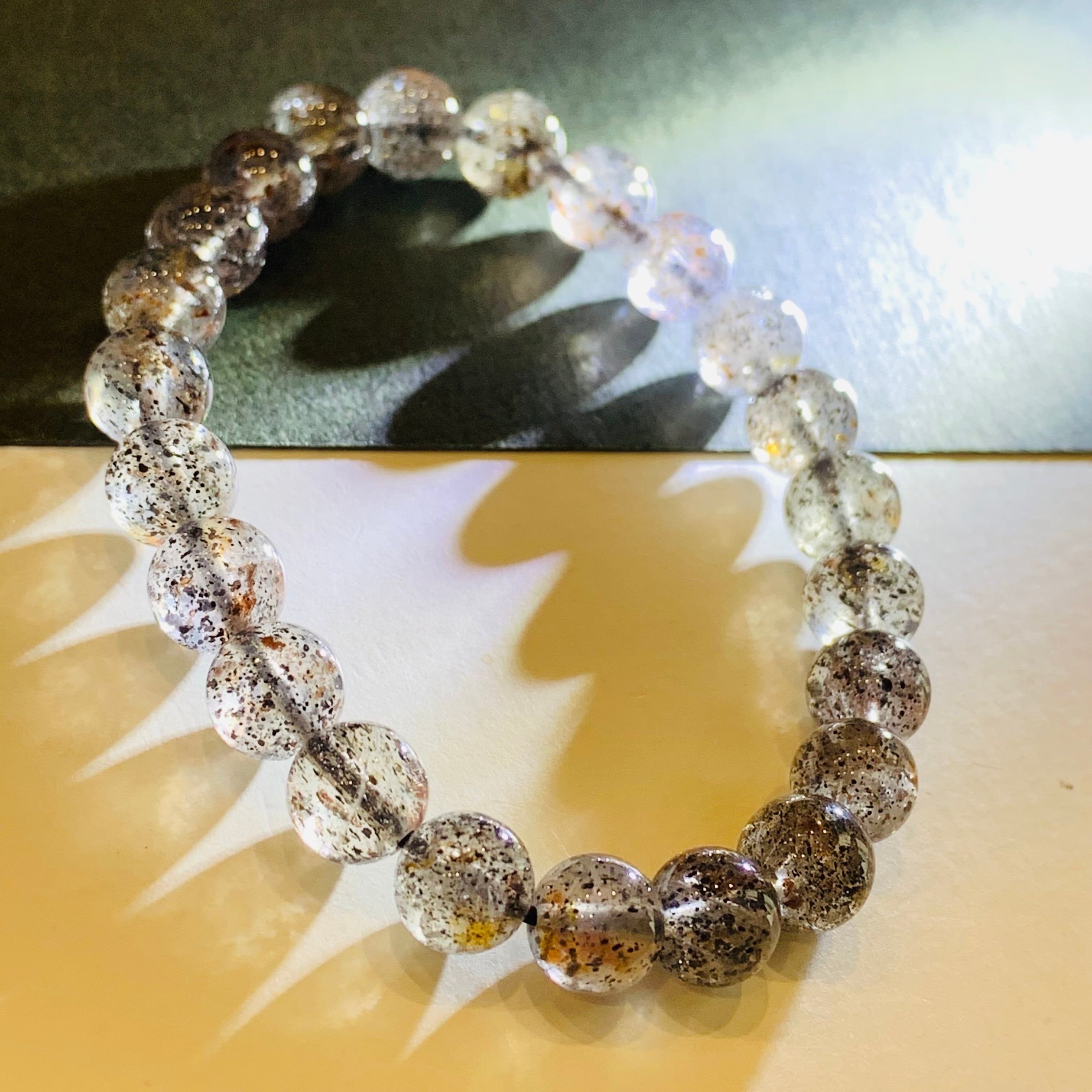 バイオタイトインクォーツ(Biotite in Quartz)とは、水晶の中に黒雲母(バイオタイト)などの鉱物が内包された希少な天然石で、独特の模様と光沢が特徴です。別名「命の石」とも呼ばれ、未来への前進する力や希望をもたらすパワーストーンとして人気があり、孤独や不安を癒し、ポジティブなエネルギーを与える効果があるとされています。