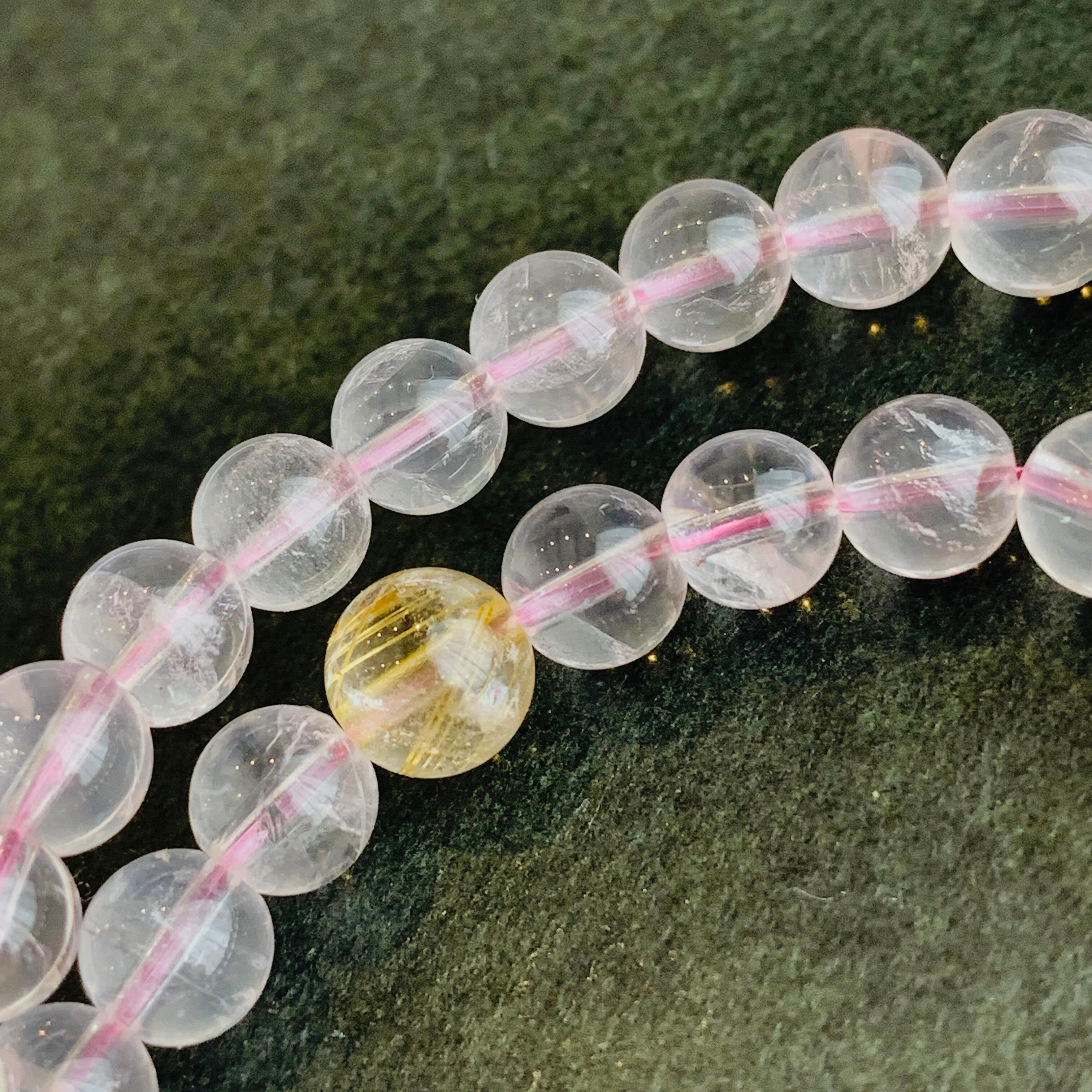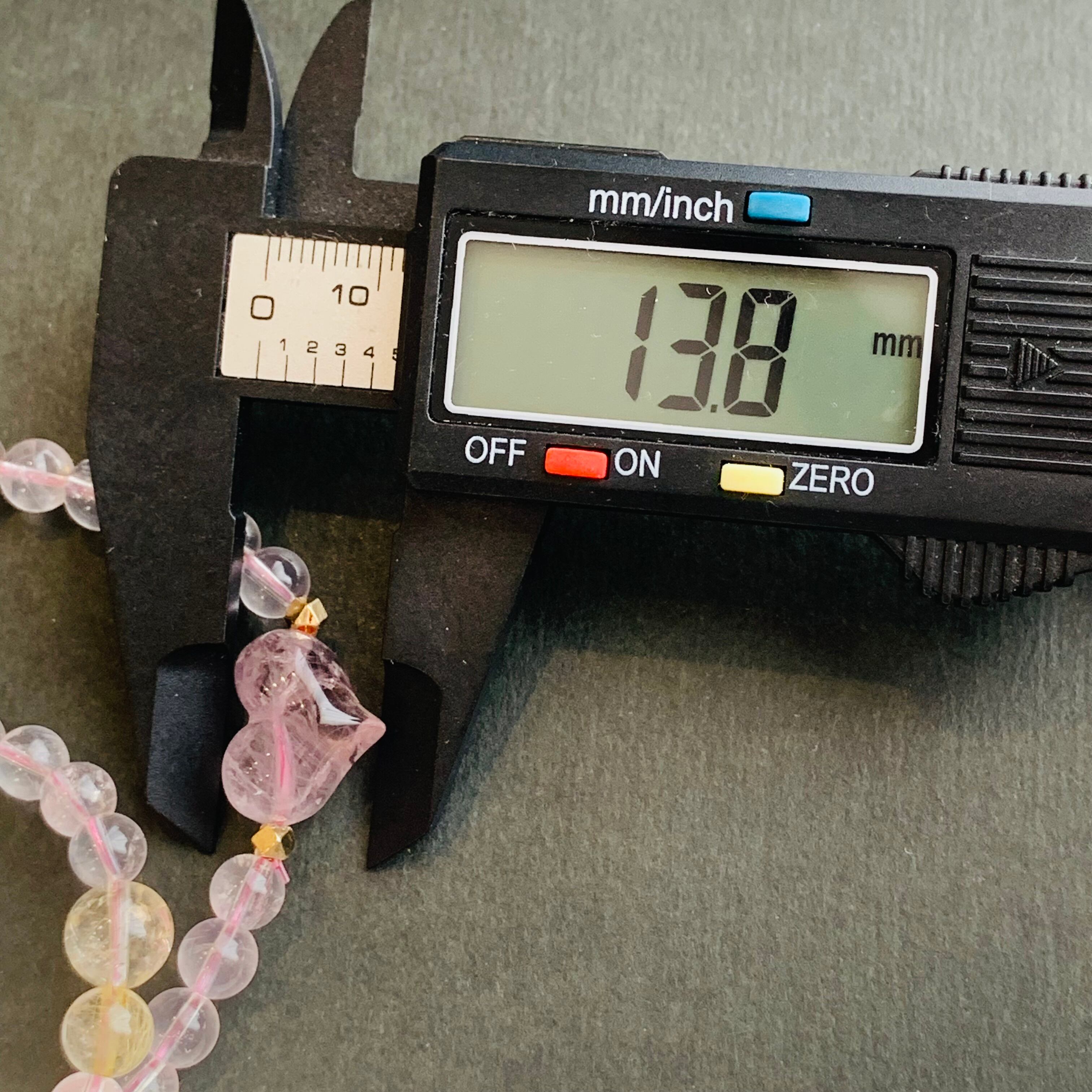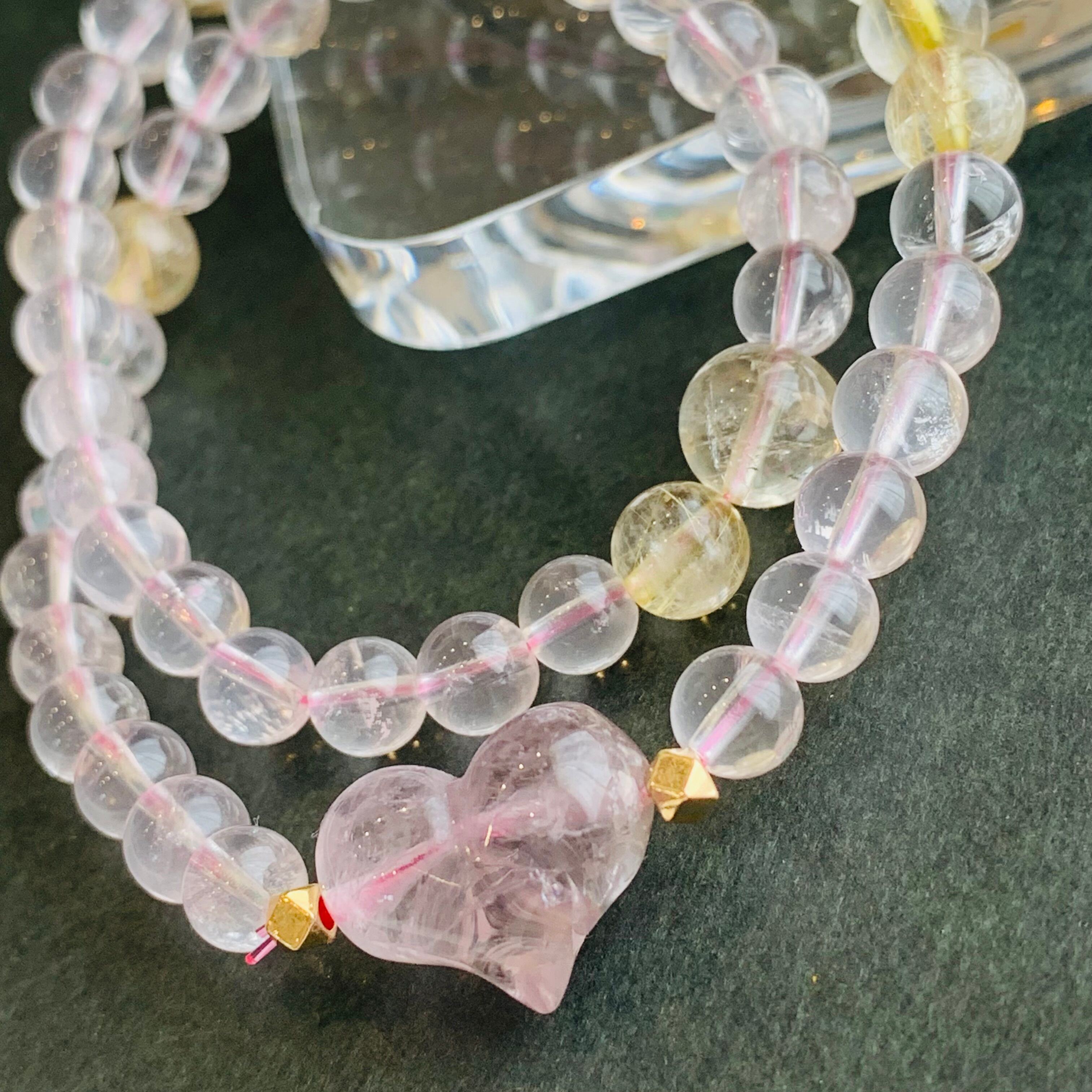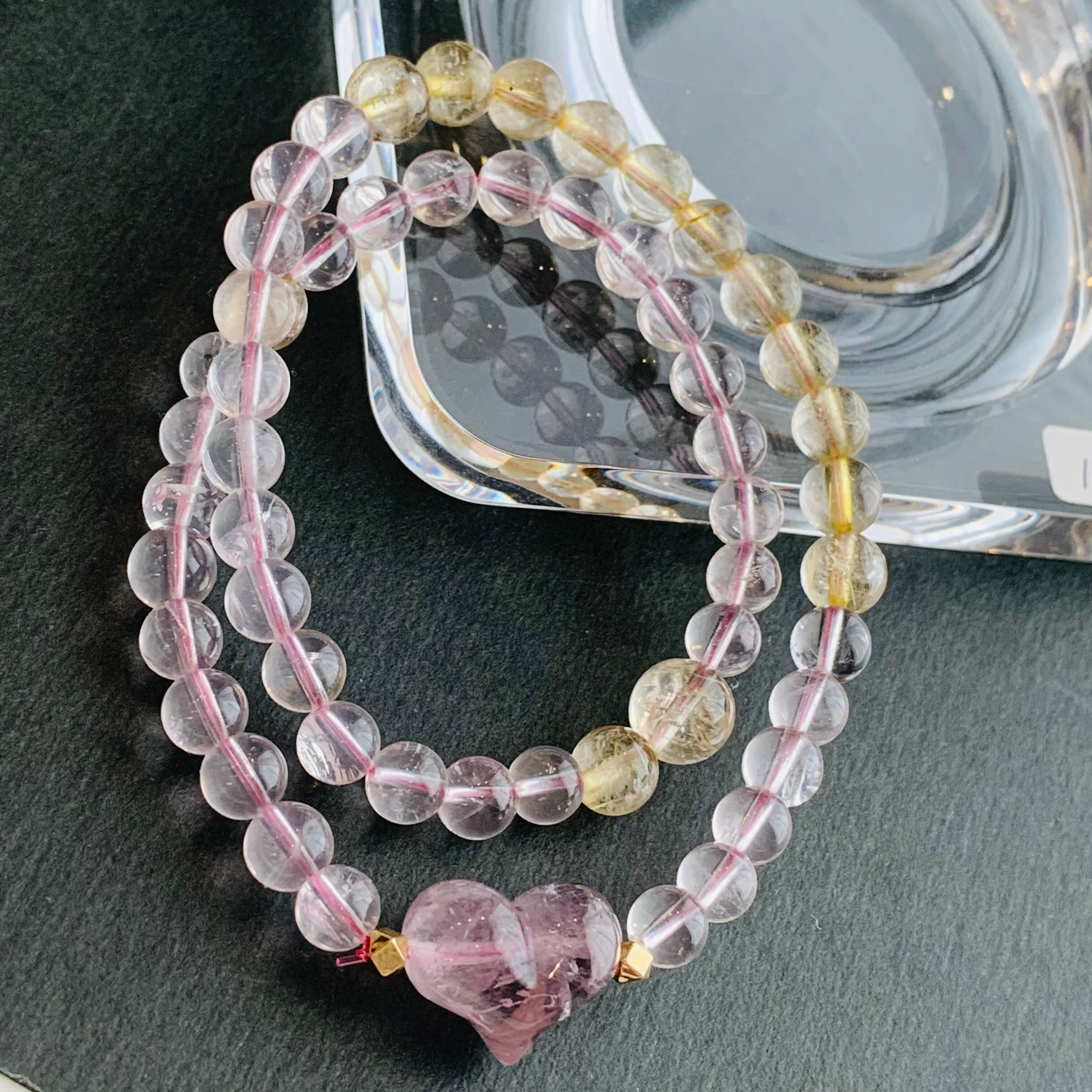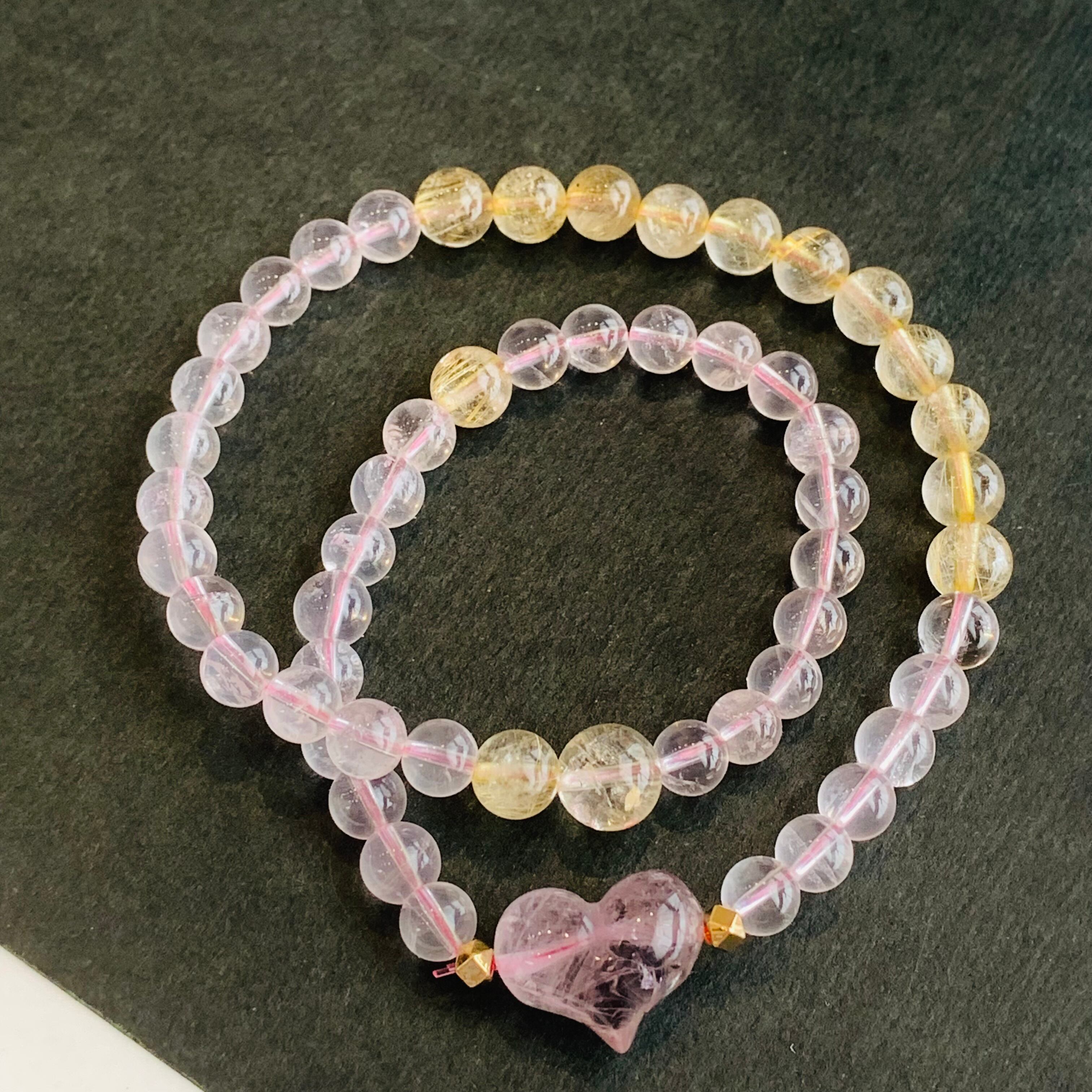 天然ローズクォーツとゴールドルチルメインにアメジストハート1粒に虹シトリンの2連ブレスレット