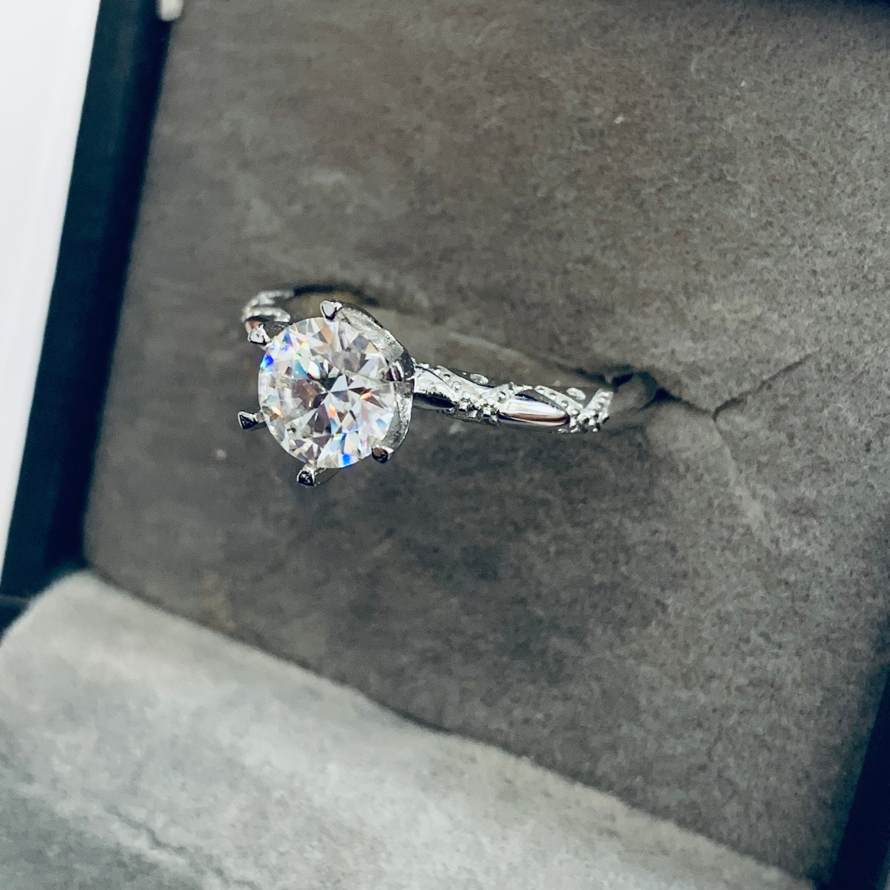 「モアサナイト」は「炭化ケイ素」という物質の結晶です。天然モアサナイトの結晶は希少性があまりに高く、使用が禁じられています。そのため、科学者たちがこの美しい素材の製造を試み、ついにジュエリーとして使用できるモアサナイトの開発に成功し、1998年ごろからモアサナイトが市場に流通するようになりました。 海外では、モアサナイトは既に宝石として広く認知され、婚約指輪として選ばれることも増えてきています。