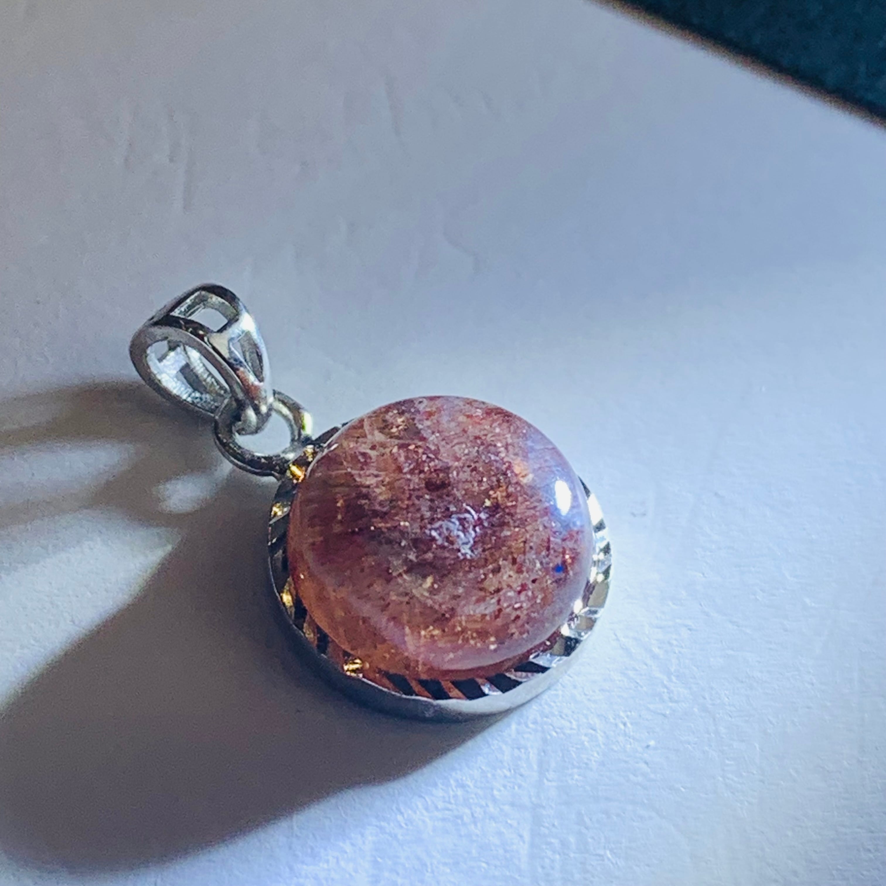 黒をベースとしたムーンストーンに、ゴールドとシルバーのシーラ、そして内包された繊維状のレピドクロサイトに光が反射して現れるアベンチュレッセンス、そして稀にキャッツアイ効果(シャットヤンシー)が現れるものがあります。