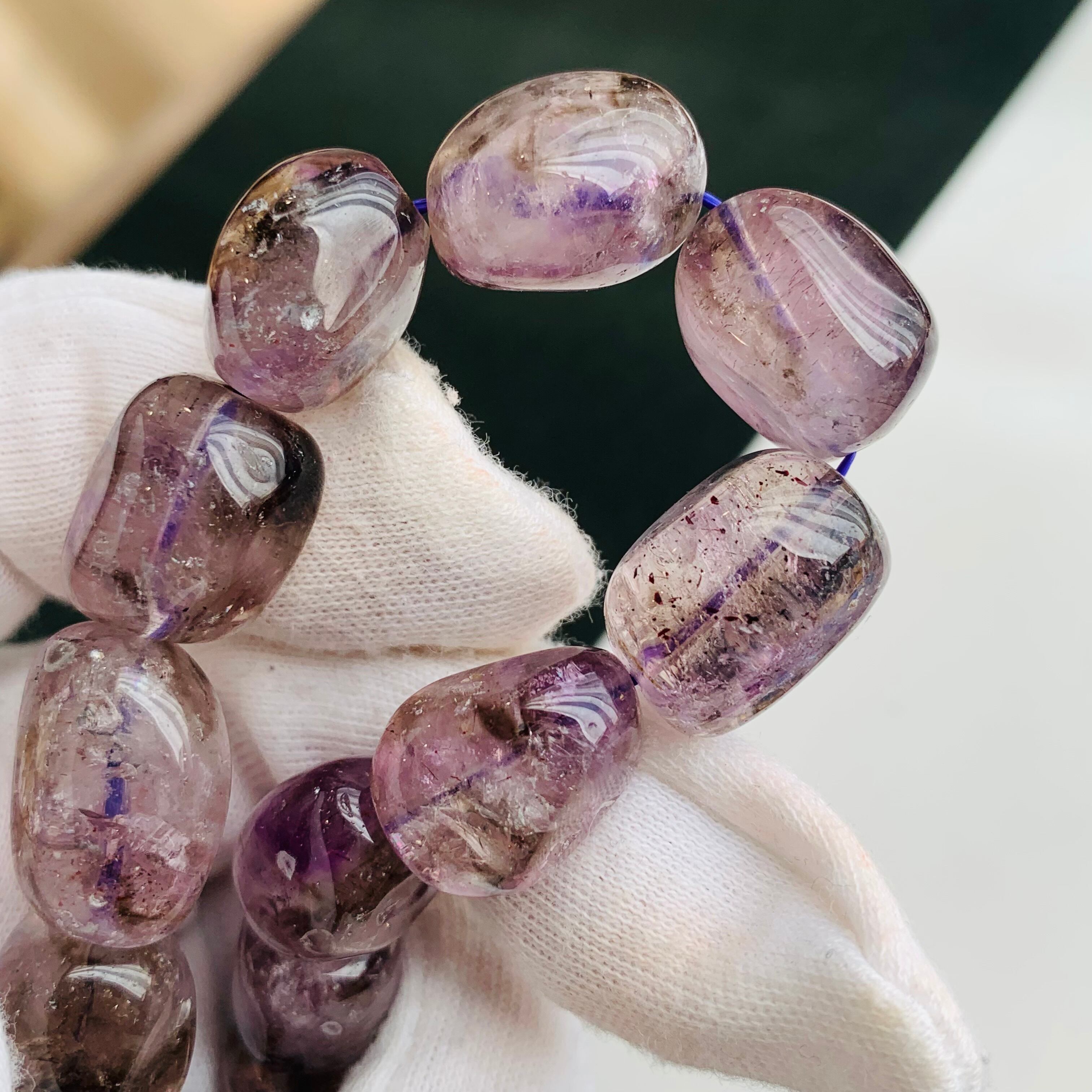 アメジストエレスチャルは、アメジストが成長していく数千年から数億年の長い期間で、内部にゲーサイトやレピドクロサイトなど、様々な鉱物を取り込むことで生まれたパワーストーンです。鉱物の内包具合や、アメジストの透明度などによって品質が大きく分かれ、内包物が多くなり、鉱物自体に見られる成分の種類が7種類になると「スーパーセブン」と呼ばれます。